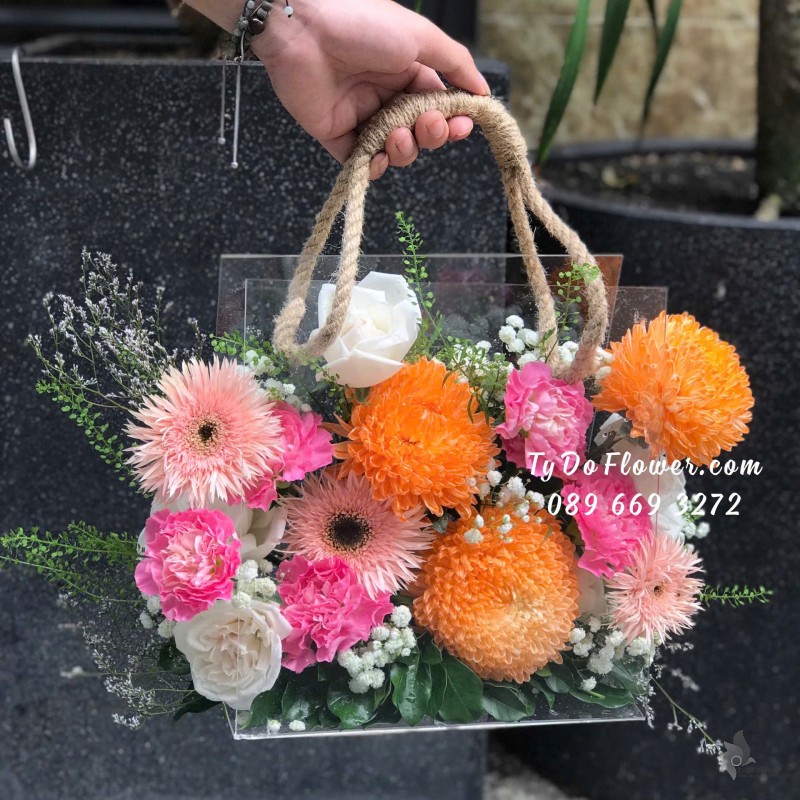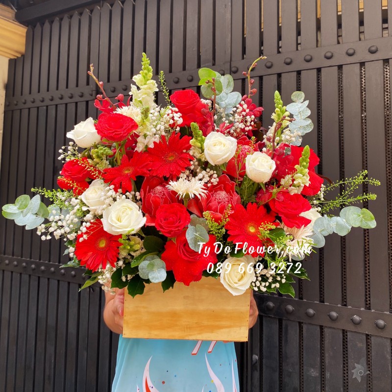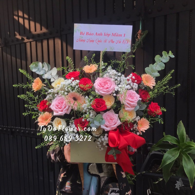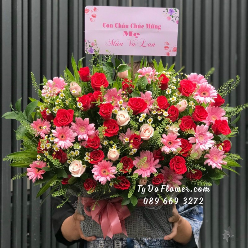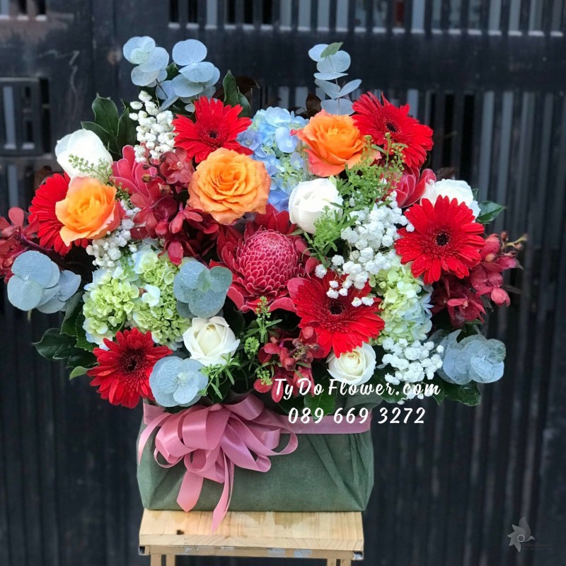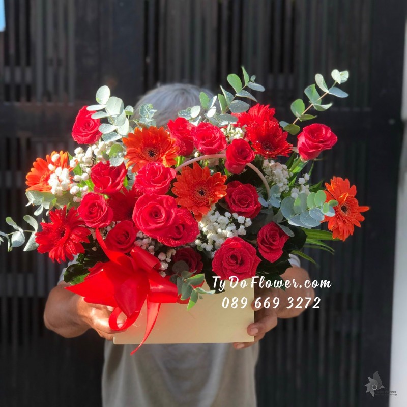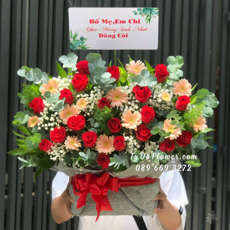 GIỎ HOA HỒNG ĐỎ OHARA RED ROSES mix hoa phụ màu hồng cam trắng Hoa Mừng Thọ Má