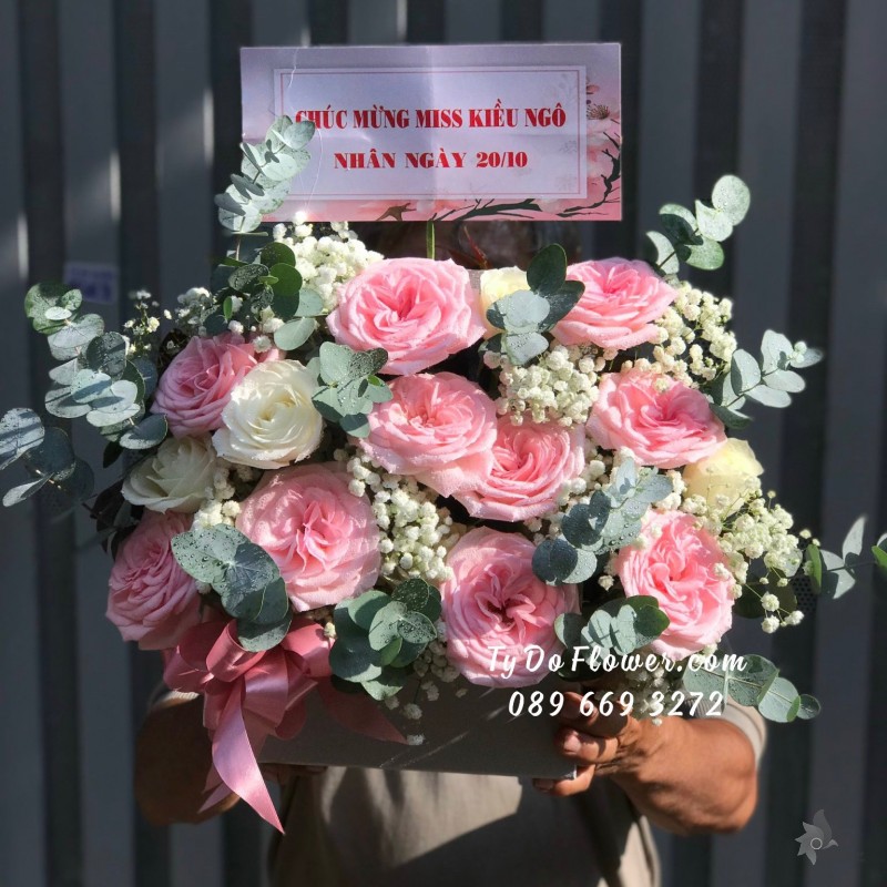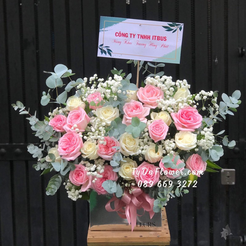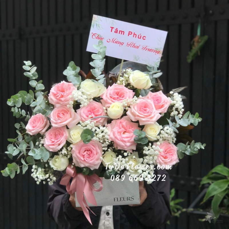 GIỎ HOA CHÚC MỪNG KHAI TRƯƠNG thiết kế Hoa Hồng Ohara mix Hoa Hồng Trắng