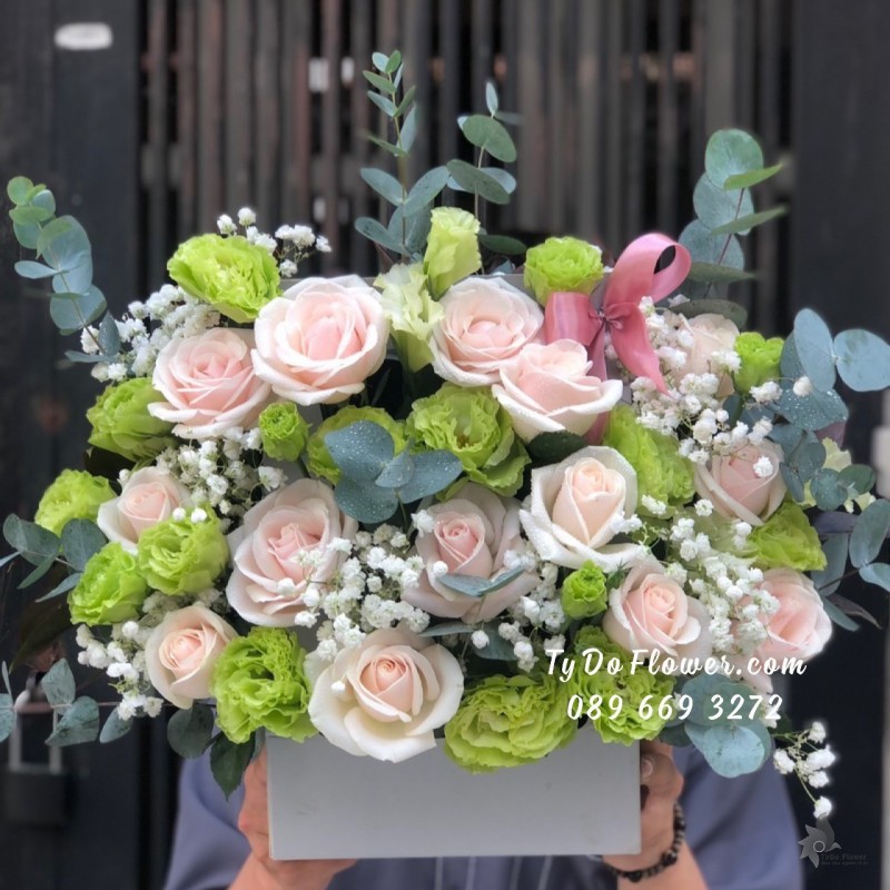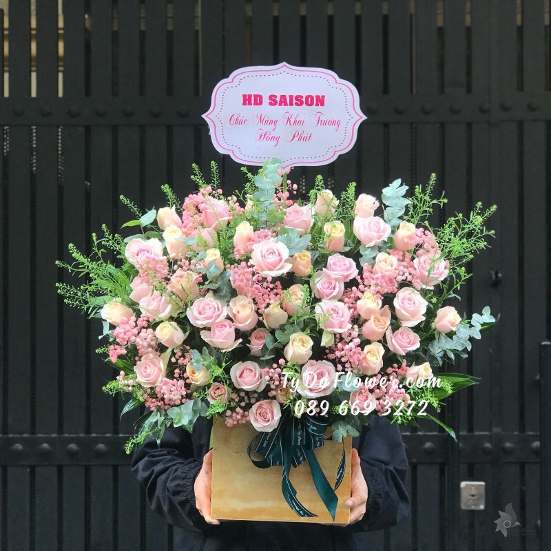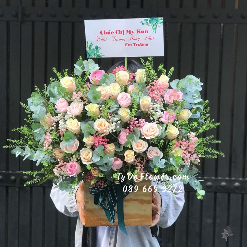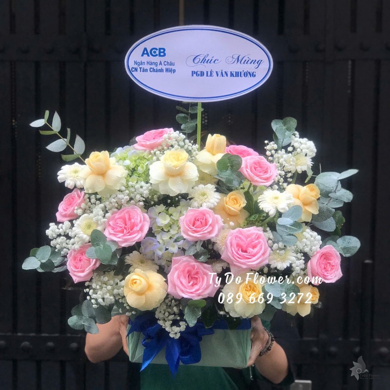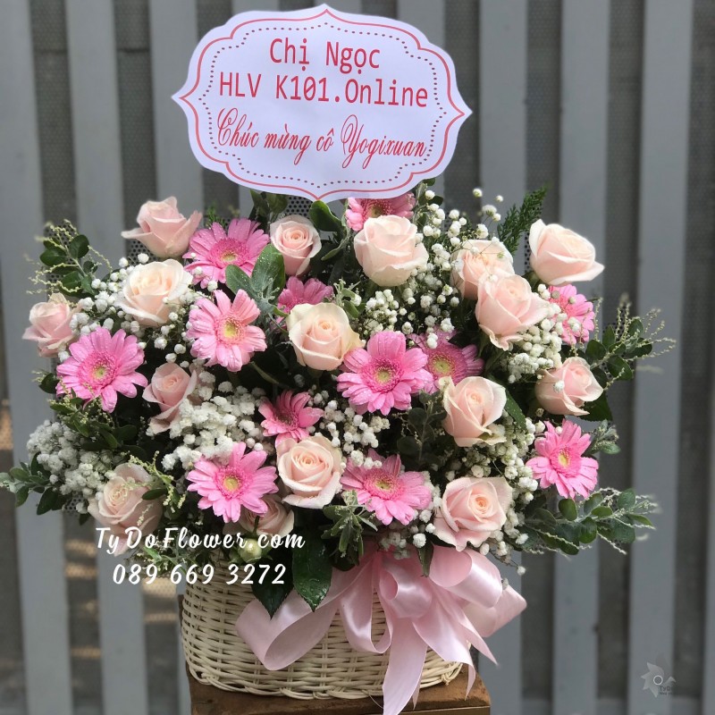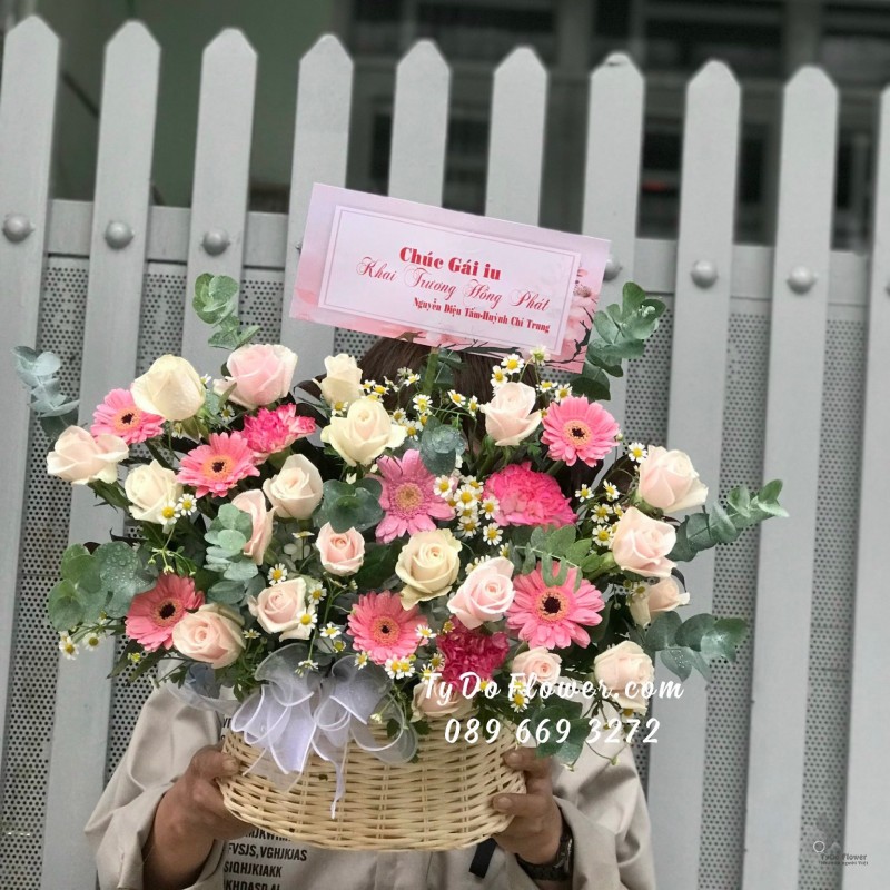 GIỎ HOA HỒNG KEM mix HOA HỒNG SEN Chúc Mừng Khai Trương Hồng Phát