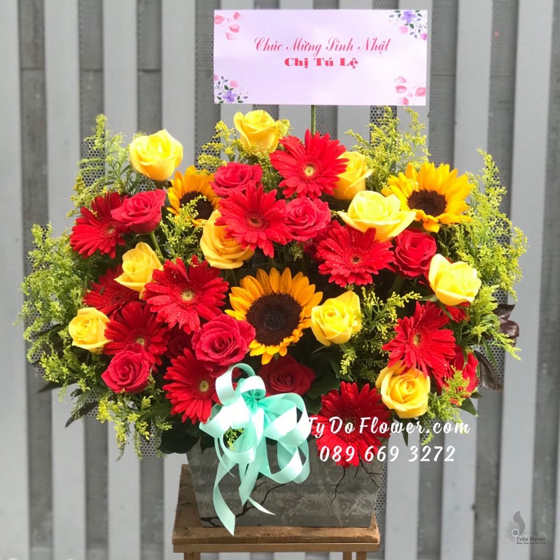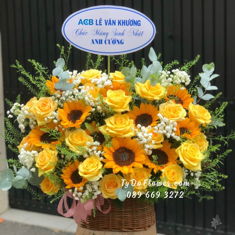 GIỎ HOA CHÚC MỪNG SINH NHẬT thiết kế Hoa Hướng Dương mix Hoa Hồng Vàng